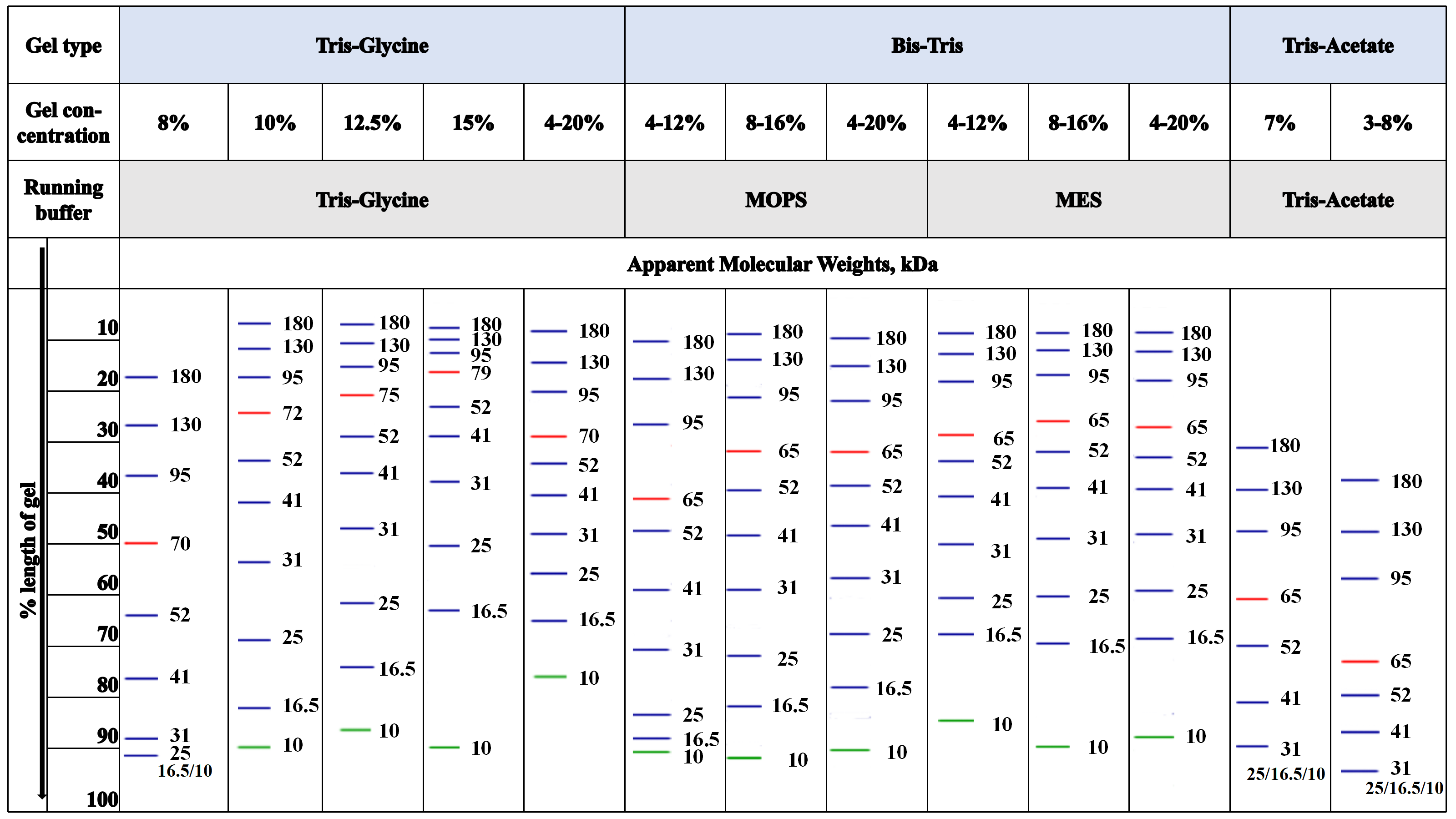 The apparent molecular weight of each protein (kDa) has been determined by calibration of each protein against an unstained protein ladder in specific electrophoresis conditions. Migration patterns were determined using commercial precast mini gels.